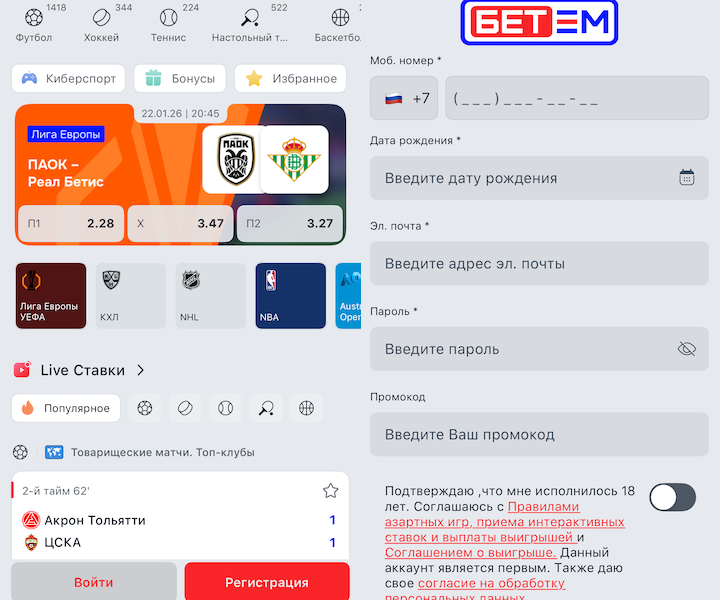 Регистрация в «Бет-М» не занимает много времени. Для этого необходимо перейти на официальный сайт или в мобильное приложение букмекера и нажать кнопку «Регистрация». Дальше все нативно и просто: телефон, дата рождения, электронная почта и пароль. Ну и согласиться с правилами и обработкой данных.