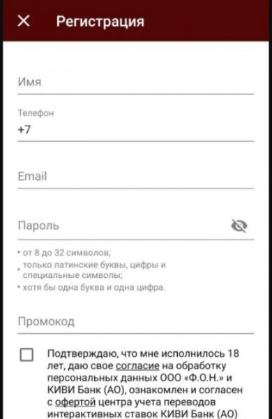 Регистрация в мобильном приложении БК «Фонбет»