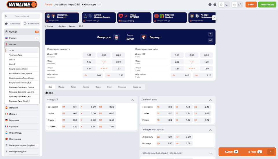 В «Live» ситуация значительно лучше. Линия для лайв ставок БК Winline на второстепенные события достигает 35-50 рынков, на основные до 100. Топовые матчи и Лига Чемпионов собирают большое количество беттеров, поэтому они предполагают онлайн ставки на спорт в Винлайн с повышенными коэффициентами.