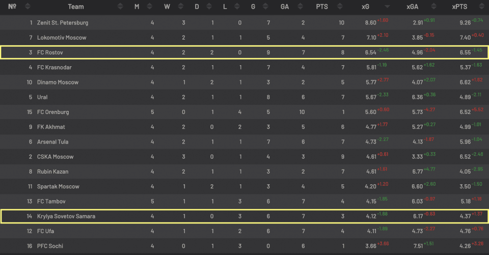 «Крылья» сейчас находят на 14-м месте. Три поражения в четырёх матчах. Это явно не тот старт, на который рассчитывали «волжане». Положение в турнирной таблице команды из Самары пока соответствует тому, что они «набивают» по xG: четвертые по xGa (6.17), 14-е по xG (4.12).