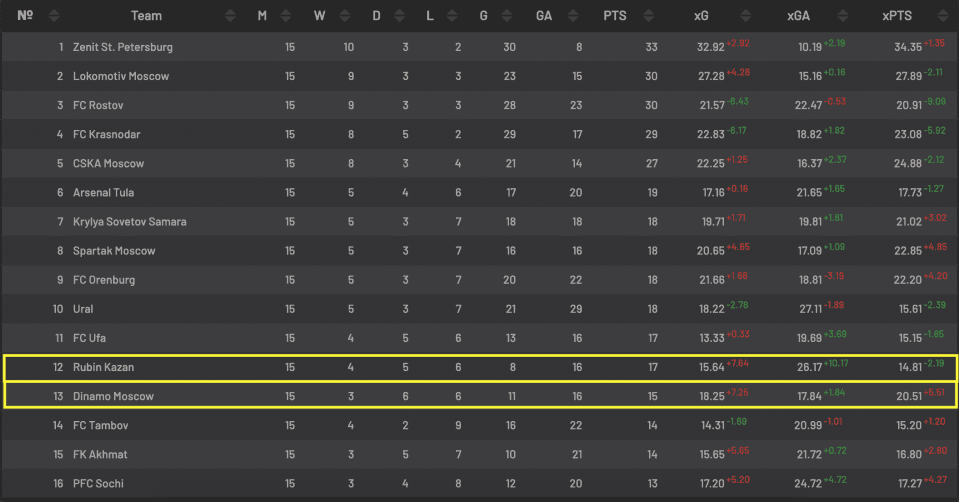 На прошлой неделе казанцы сыграли уже четвертую безголевую ничью в этом розыгрыше РПЛ. На этот раз «Рубин» сыграл вничью с «Крыльями Советов». Пожалуй, казанский коллектив занимает логичное для себя место на данный момент. Их позиция примерно соответствует набранным и допущенным xG. Единственное, что у казанцев есть «андерперформ» в атаке xG - G = +7.64. «Рубин» меньше всех забил в чемпионате - восемь голов. Пока удручающе смотрится команда из столицы Татарстана. Похоже, что они ждут перерыва в чемпионате, чтобы взять паузу и попробовать спасти сезон новыми трансферами.