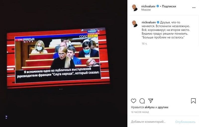 «Друзья, что-то меняется. Вспомнили незалежную. Всё, коронавирус на второе место. Видимо градус решили понизить. «Больше проблем не осталось», - написал Николай Валуев.