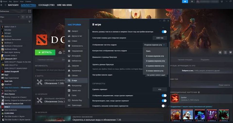 Или как включить отображение FPS в Dota 2? Это можно сделать и через Steam. В этом случае в левом углу приложения нажимаем на поле Steam и кликаем на «Настройки». В пункте «В игре» находим параметр «Отображение частоты кадров» и выбираем один из предложенных вариантов положения счетчика.