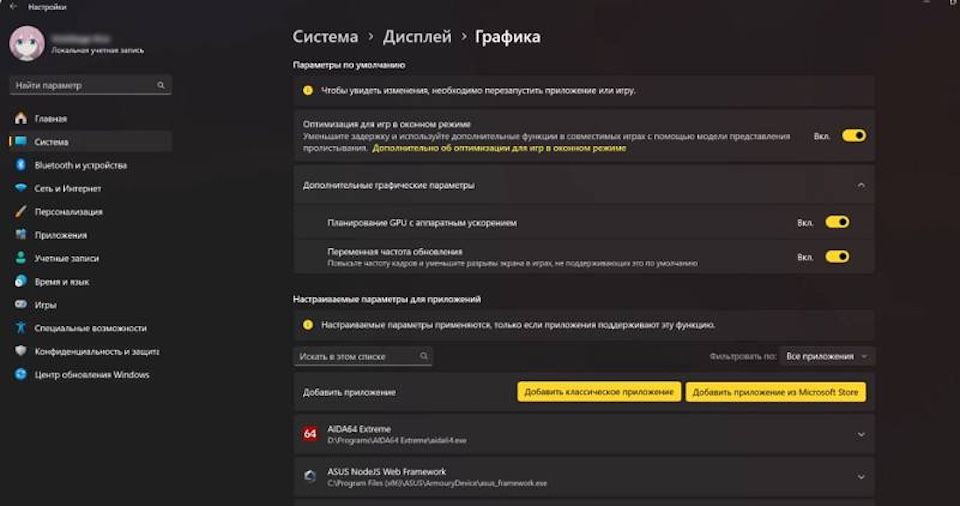 Игрок сначала должен тапнуть на клавишу Win на клавиатуре, затем в поле поиска ввести «Параметры» и нажать на появившийся значок шестеренки, перейти в раздел «Система» → «Дисплей» → «Графика», включить настройки «Оптимизация для игр в оконном режиме» и в дополнительных графических параметрах «Планирование GPU с аппаратным ускорением» и «Переменная частота обновления», если функция поддерживается. Тут же, в «Параметрах», можно перейти во вкладку «Игры» → «Игровой режим» и включите параметр «Режим игры».