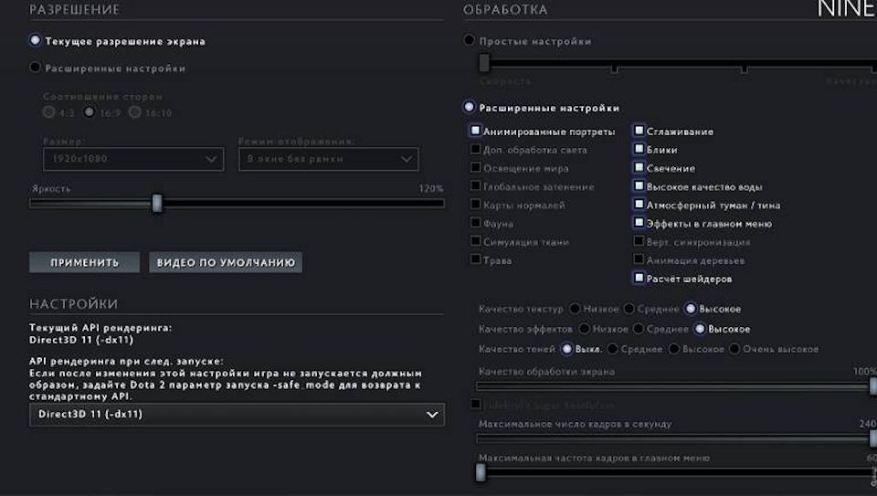 Действующий чемпион мира и победитель The International 2022, Nine, оставляет включёнными почти половину графических параметров.